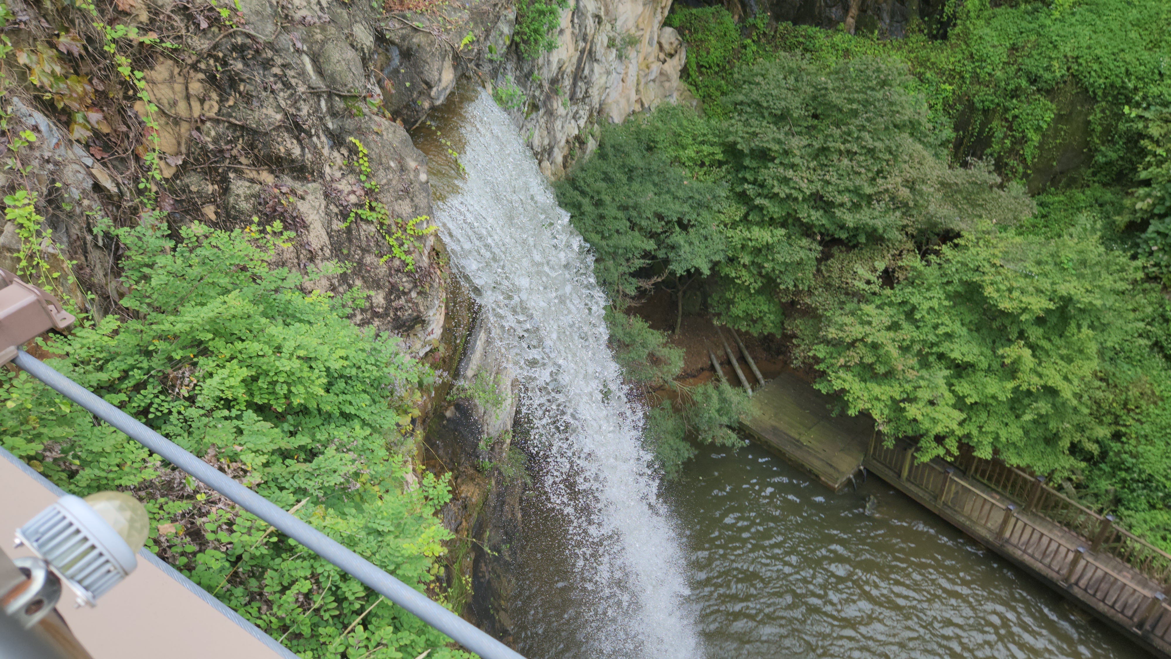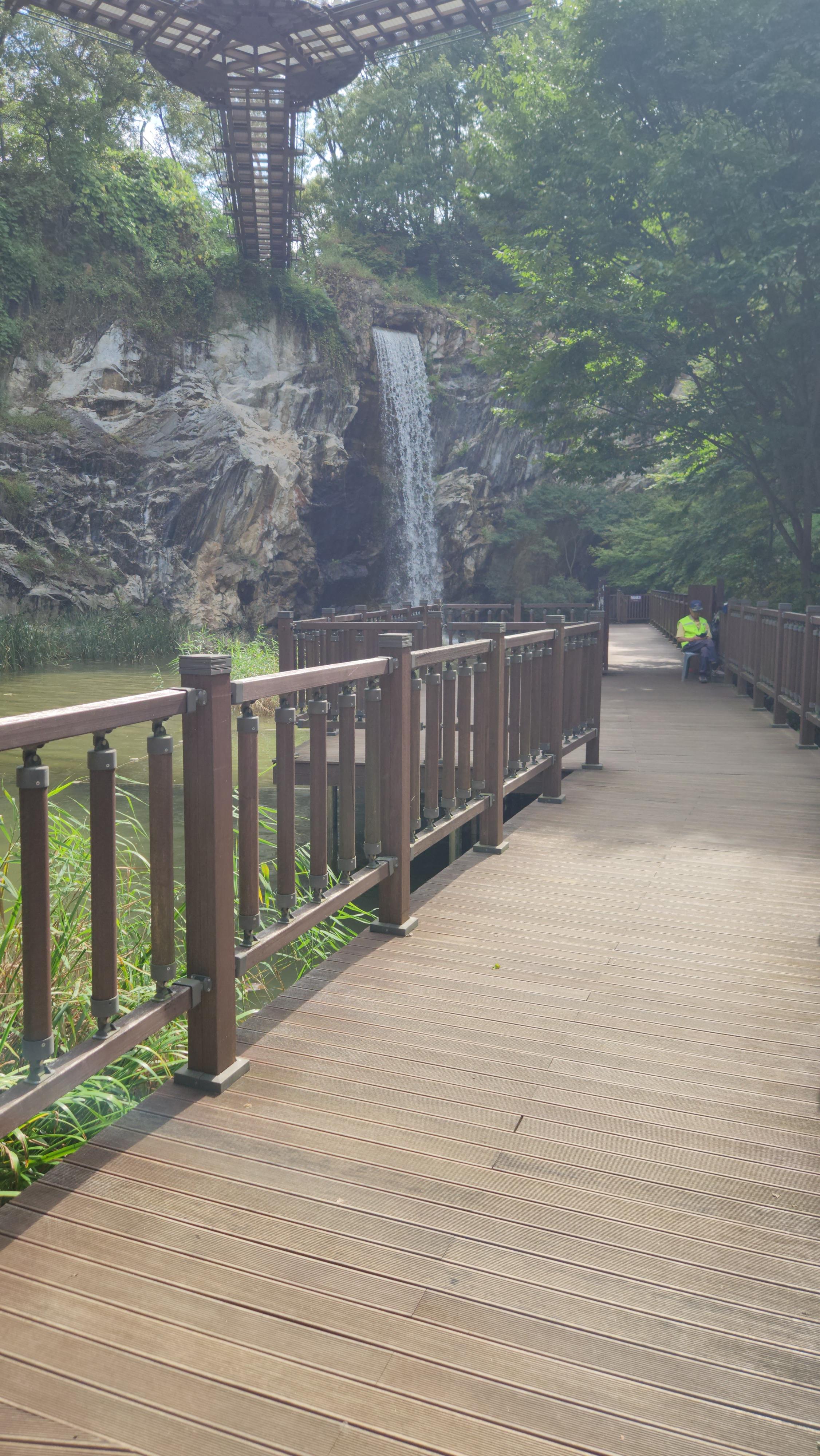 인공폭포와 깎아지른 절벽과 관람데크가 보입니다.