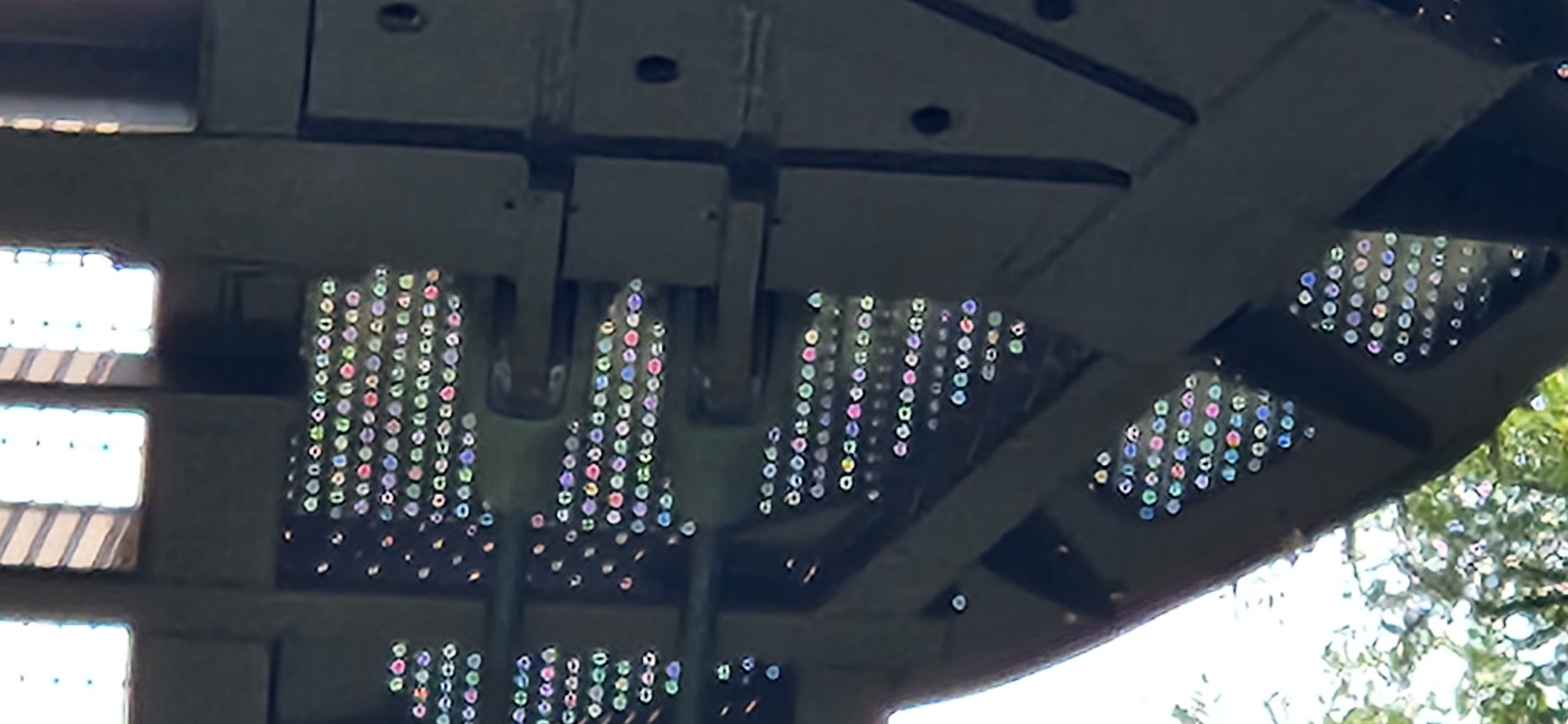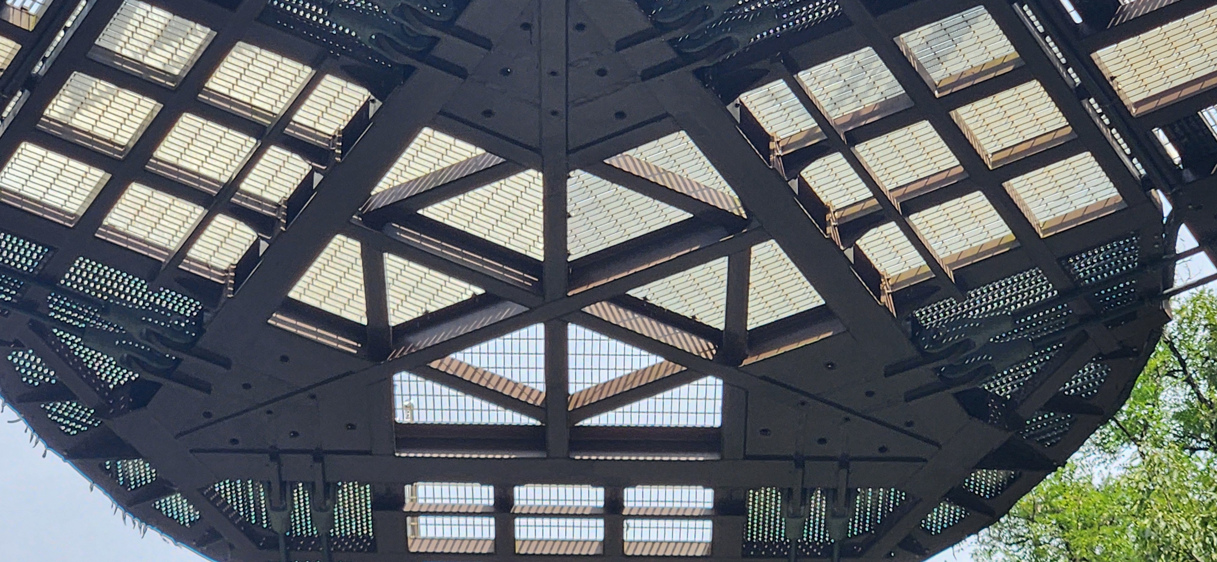 교량 가운데 원형구조물 하부에는 삼각형의 프레임이 있습니다.
