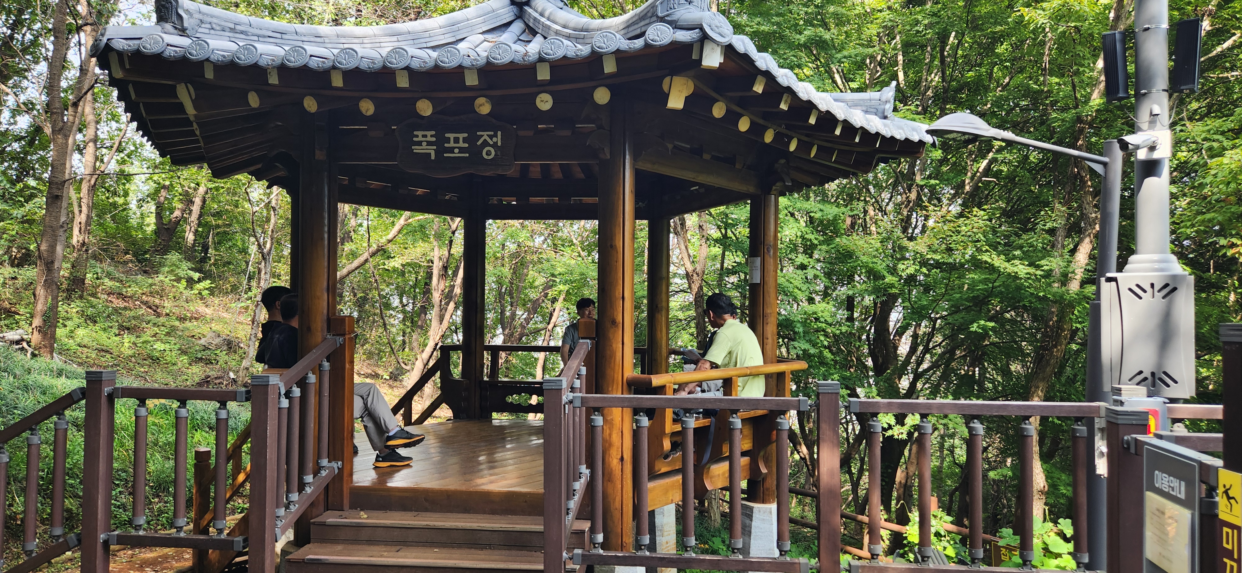 폭포정이라고 이름된 정자에서 사람들이 휴식을 취하고 있습니다.