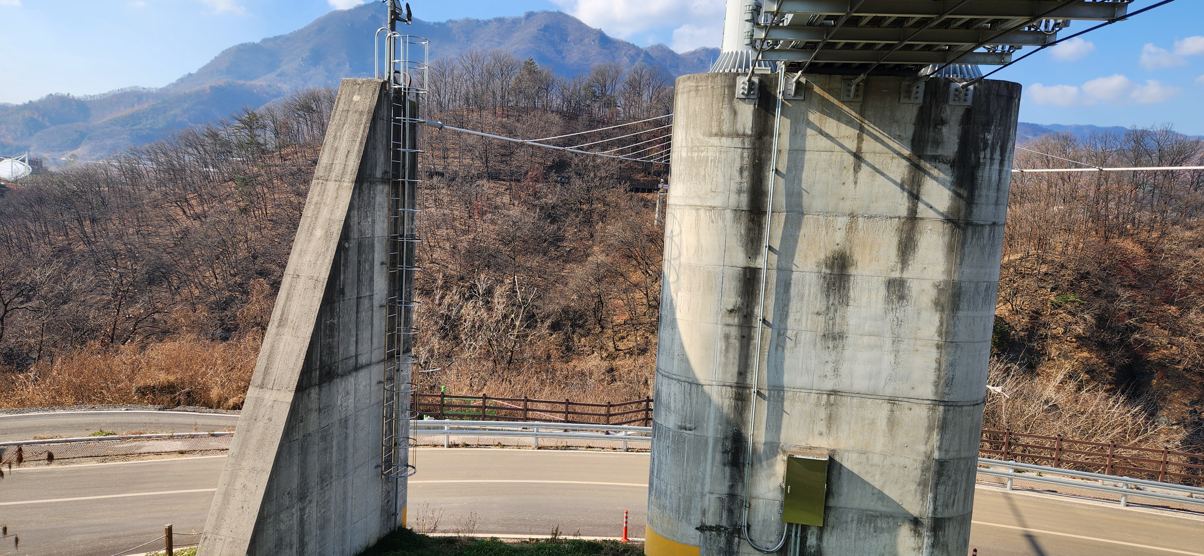 이 교량은 특이하게 측면에 케이블이 있고, 그 케이블을 지지하는 앵커리지가 주탑 좌, 우측에 설치되어 있습니다.